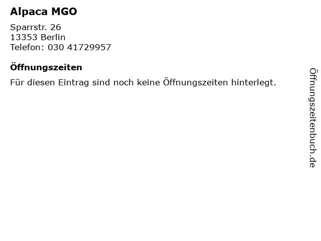 | Öffnungszeiten Alpaca MGO in Berlin anzeigen | |