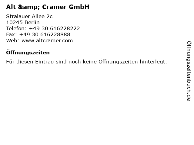 | Öffnungszeiten Alt & Cramer GmbH in Berlin anzeigen | |