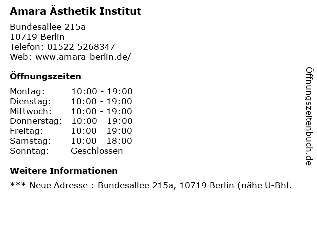 Öffnungszeiten Amara Ästhetik Institut in Berlin anzeigen | |