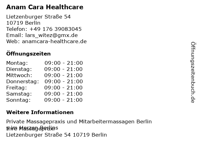 | Öffnungszeiten Anam Cara Healthcare in Berlin anzeigen | |