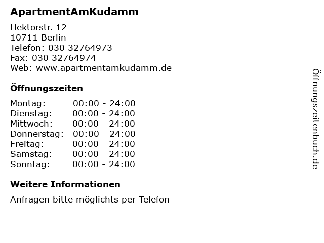 | Öffnungszeiten ApartmentAmKudamm in Berlin anzeigen | |