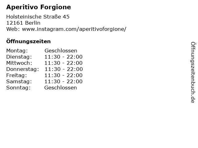 | Öffnungszeiten Aperitivo Forgione in Berlin anzeigen | |