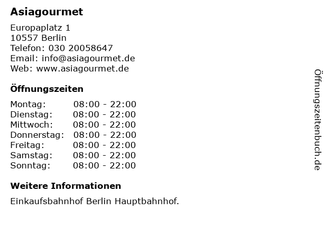 | Öffnungszeiten Asiagourmet in Berlin anzeigen | |