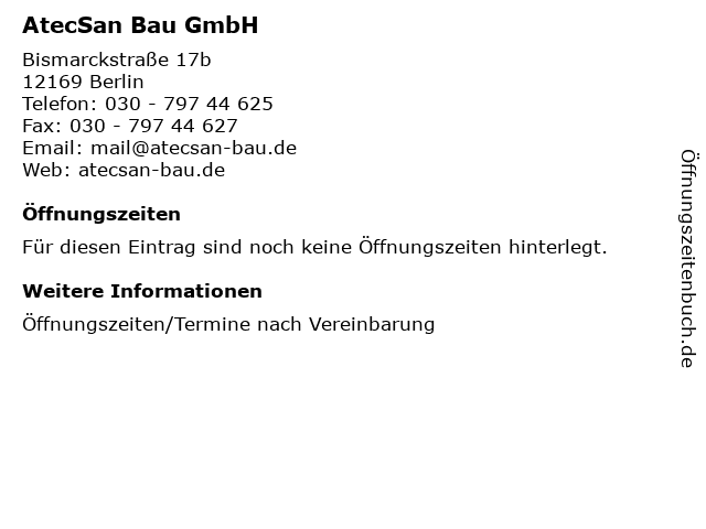 | Öffnungszeiten AtecSan Bau GmbH in Berlin anzeigen | |
