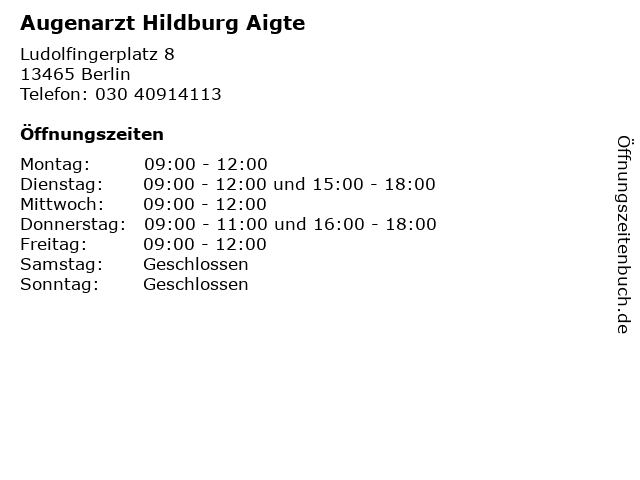 | Öffnungszeiten Augenarzt Hildburg Aigte in Berlin anzeigen | |