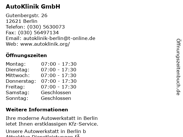 | Öffnungszeiten AutoKlinik GmbH in Berlin anzeigen | |