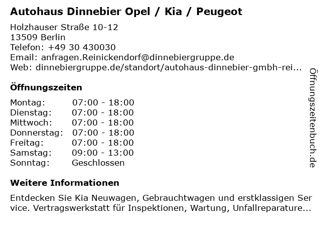 1 Autohaus Dinnebier Berlin Reinickendorf - Service / Teile & Zubehör (Entfernung: 0,00 km) Holzhauser Straße 10-12, 13509 Berlin 3 Peugeot Berlin Brandenburg GmbH - Reparaturannahme (Entfernung: 3,44 km) Roedernallee 3-7, 13407 Berlin 4 Peugeot Berlin Brandenburg GmbH - Teile und Zubehör (Entfernung: 3,44 km) Roedernallee 3-7, 13407 Berlin 5 Premium Cars, Niederlassung der AH Dinnebier GmbH (Teile & Zubehör) (Entfernung: 8,52 km) Kurfürstendamm 106 -108, 10711 Berlin 6 |