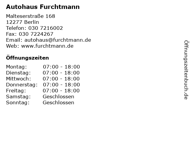 | Öffnungszeiten Autohaus Furchtmann in Berlin anzeigen | |