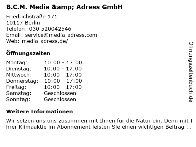 | Öffnungszeiten B.C.M. Media & Adress GmbH in Berlin anzeigen | |