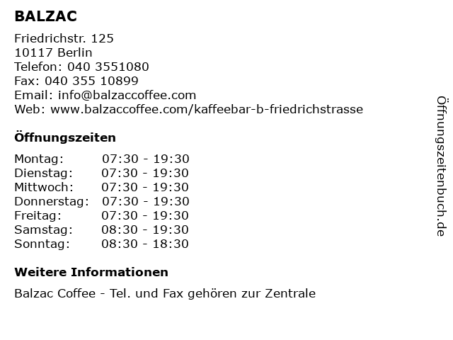 | Öffnungszeiten BALZAC in Berlin anzeigen | |