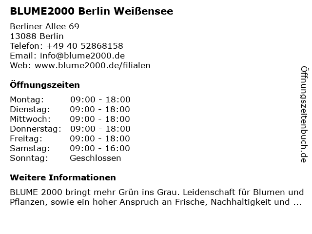 | Öffnungszeiten BLUME2000 Berlin Weißensee in Berlin anzeigen | |