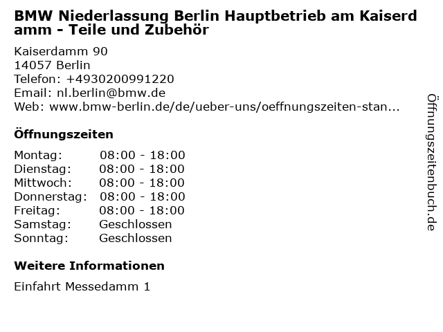 1 BMW Niederlassung Berlin Hauptbetrieb am Kaiserdamm - Neue Automobile (Entfernung: 0,00 km) Kaiserdamm 90, 14057 Berlin 2 BMW Niederlassung Berlin Hauptbetrieb am Kaiserdamm - Service PKW (Entfernung: 0,00 km) Kaiserdamm 90, 14057 Berlin 6 |