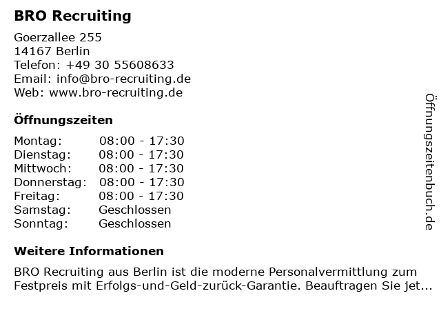 | Öffnungszeiten BRO Recruiting in Berlin anzeigen | |