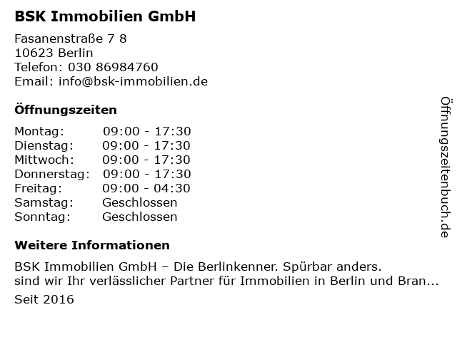 | Öffnungszeiten BSK Immobilien GmbH in Berlin anzeigen | |