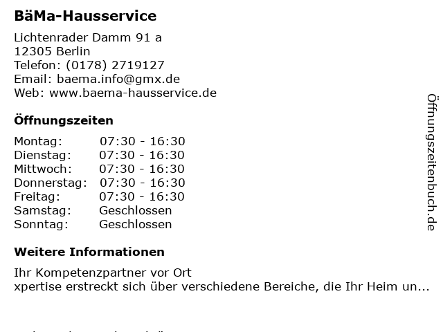 | Öffnungszeiten BäMa-Hausservice in Berlin anzeigen | |