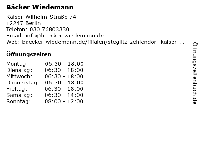 | Öffnungszeiten Bäcker Wiedemann in Berlin anzeigen | |