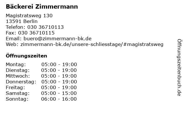 | Öffnungszeiten Bäckerei Zimmermann in Berlin anzeigen | |