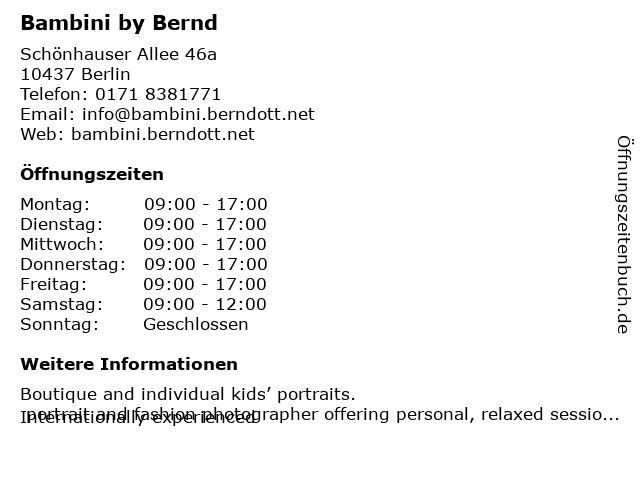 | Öffnungszeiten Bambini by Bernd in Berlin anzeigen | |
