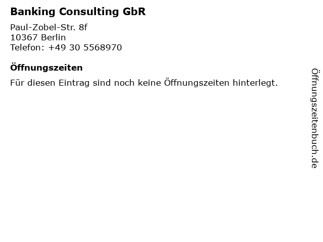 | Öffnungszeiten Banking Consulting GbR in Berlin anzeigen | |