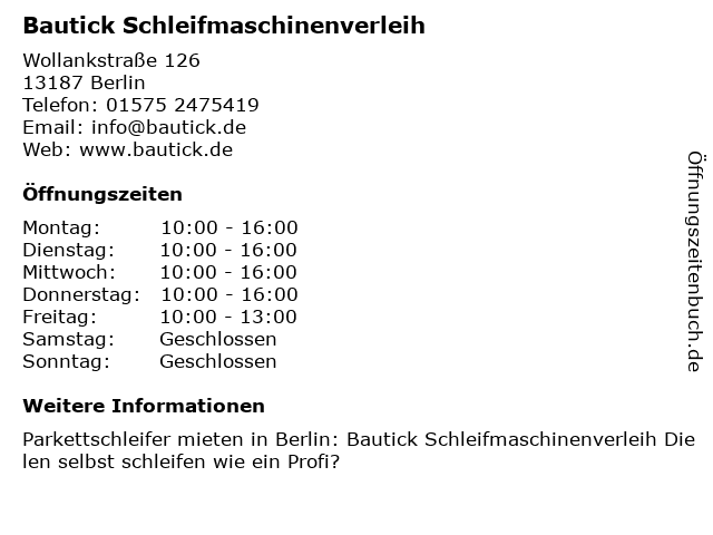 1 BauTick Dielen-Parkett-Schleifmaschinenverleih Inh. M. Cys (Entfernung: 0,01 km) Wollankstr. 126, 13187 Berlin 2 6 |