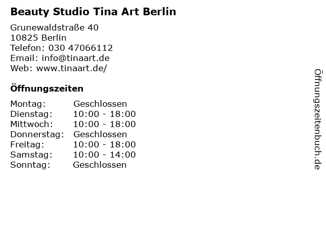 | Öffnungszeiten Beauty Studio Tina Art Berlin in Berlin anzeigen | |