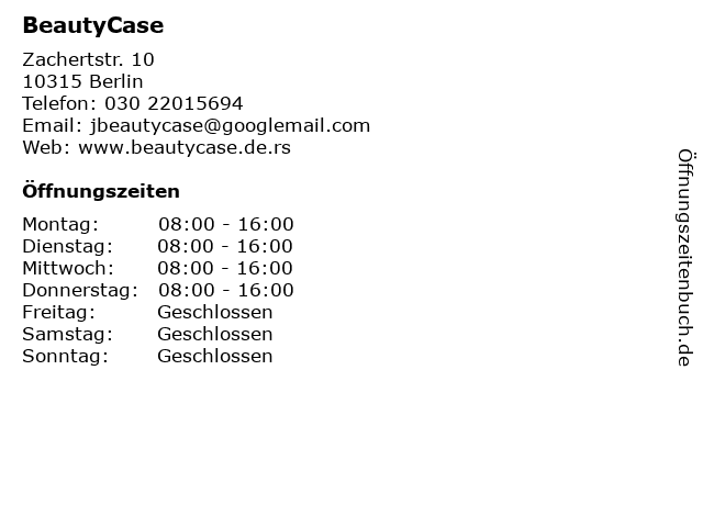 | Öffnungszeiten BeautyCase in Berlin anzeigen | |
