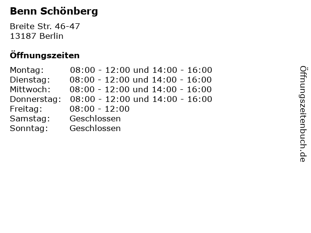 | Öffnungszeiten Benn Schönberg in Berlin anzeigen | |