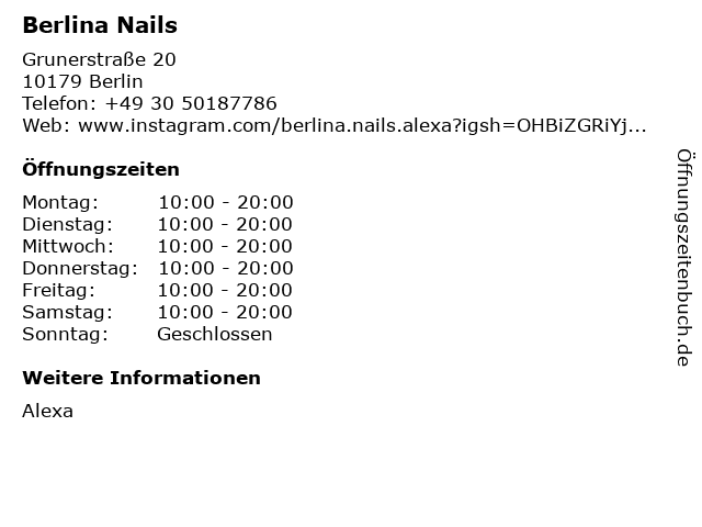 | Öffnungszeiten Berlina Nails in Berlin anzeigen | |