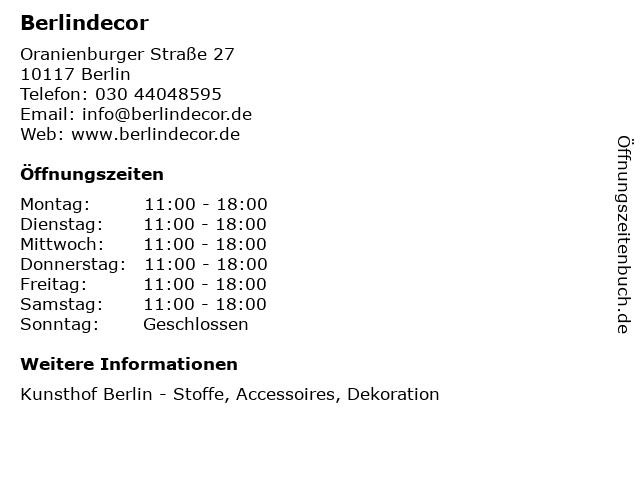 | Öffnungszeiten Berlindecor in Berlin anzeigen | |