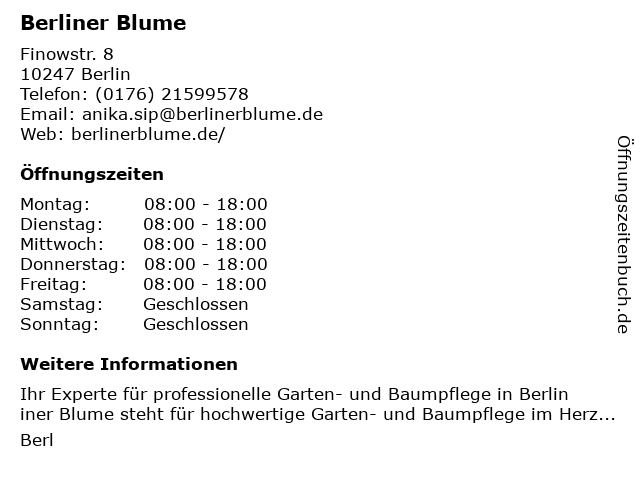 | Öffnungszeiten Berliner Blume in Berlin anzeigen | |