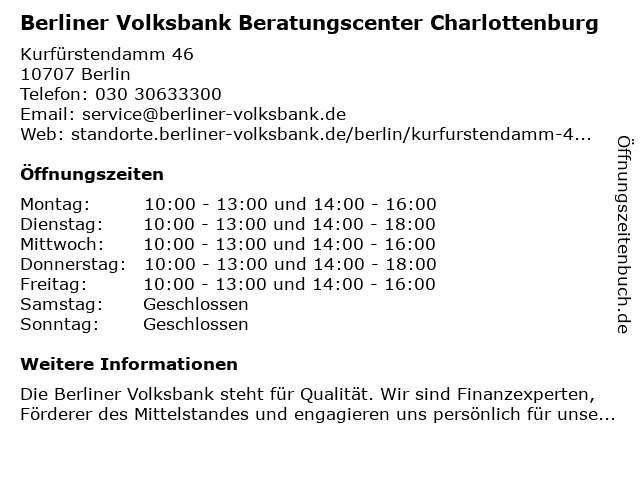 1 Berliner Volksbank eG, FinanzCenter Kurfürstendamm (Entfernung: 0,01 km) Kurfürstendamm 46, 10707 Berlin 2 Berliner Implantat-Beratungszentrum der Implantat-Zahnklinik Hannover Zahnklinik (Entfernung: 0,19 km) Bleibtreustr. 15, 10623 Berlin 3 Berliner Volksbank eG - (SB-Center Sprint-Tankstelle Lietzenburger Str) (Entfernung: 0,26 km) Lietzenburger Str. 97, 10719 Berlin 5 Ballett Centrum und Berliner Musicalschule (Entfernung: 0,34 km) Kurfürstendamm 207 - 208, 10719 Berlin 6 |