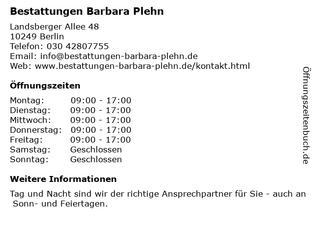 | Öffnungszeiten Bestattungen Barbara Plehn in Berlin anzeigen | |