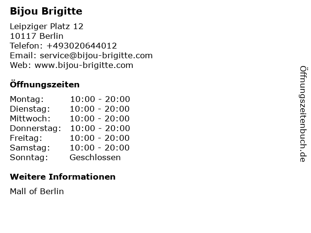 | Öffnungszeiten Bijou Brigitte in Berlin anzeigen | |