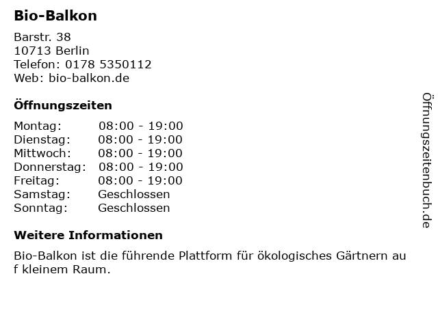 | Öffnungszeiten Bio-Balkon in Berlin anzeigen | |