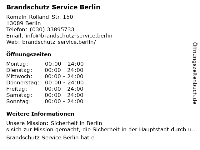 | Öffnungszeiten Brandschutz Service Berlin in Berlin anzeigen | |