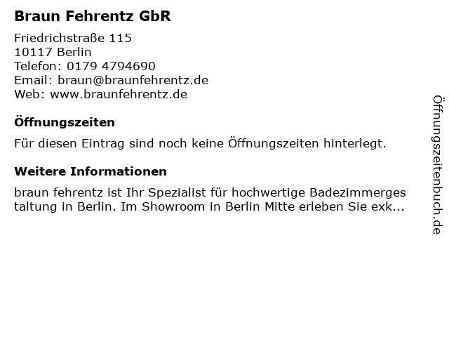 | Öffnungszeiten Braun Fehrentz GbR in Berlin anzeigen | |