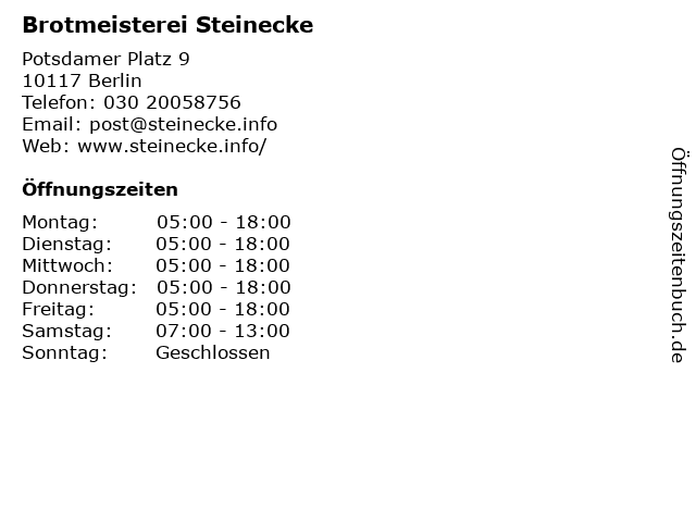 | Öffnungszeiten Brotmeisterei Steinecke in Berlin anzeigen | |