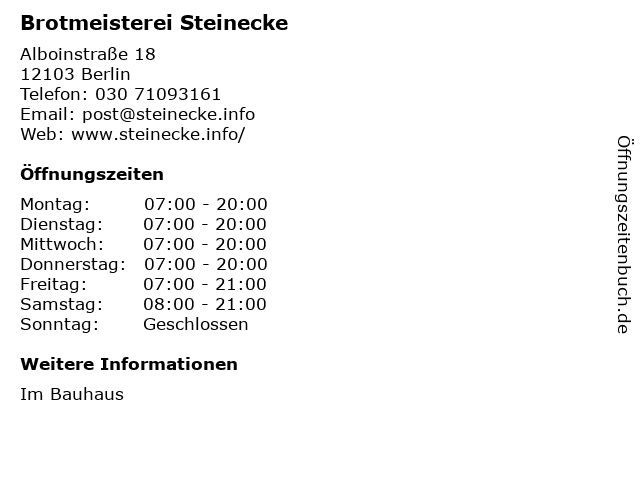 | Öffnungszeiten Brotmeisterei Steinecke in Berlin anzeigen | |