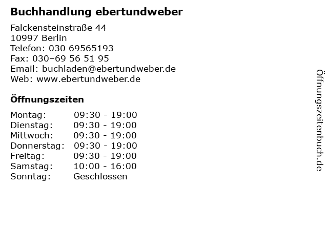 | Öffnungszeiten Buchhandlung ebertundweber in Berlin anzeigen | |
