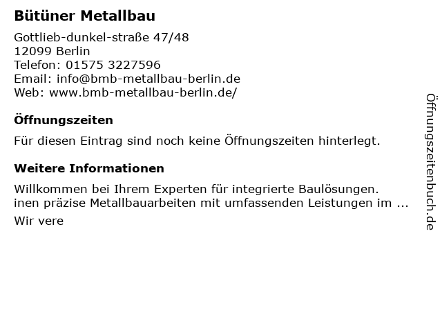 | Öffnungszeiten Bütüner Metallbau in Berlin anzeigen | |