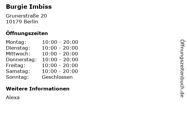 | Öffnungszeiten Burgie Imbiss in Berlin anzeigen | |