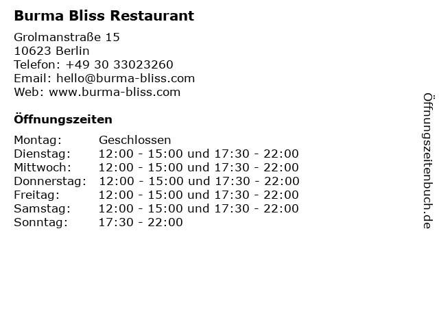 | Telefonnummer Burma Bliss Restaurant in Berlin (+49 30 33023260) anrufen | |