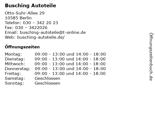 | Öffnungszeiten Busching Autoteile in Berlin anzeigen | |