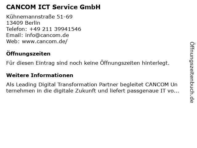 | Öffnungszeiten CANCOM ICT Service GmbH in Berlin anzeigen | |