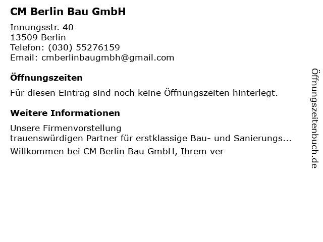 | Öffnungszeiten CM Berlin Bau GmbH in Berlin anzeigen | |