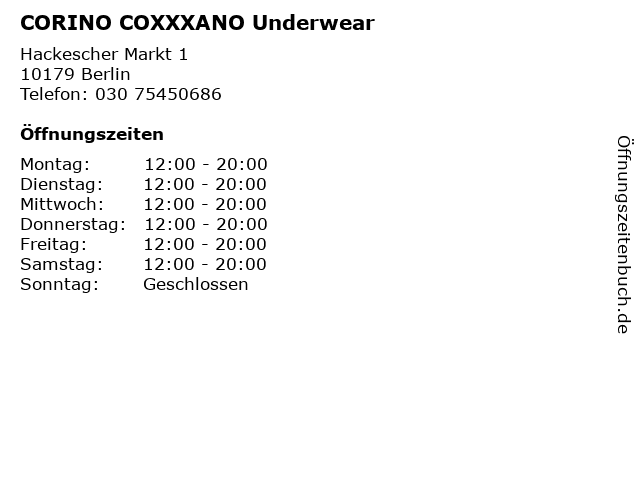 | Öffnungszeiten CORINO COXXXANO Underwear in Berlin anzeigen | |