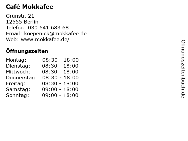 | Öffnungszeiten Café Mokkafee in Berlin anzeigen | |