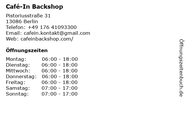 | Öffnungszeiten Café-In Backshop in Berlin anzeigen | |