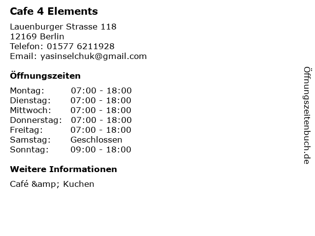 | Öffnungszeiten Cafe 4 Elements in Berlin anzeigen | |