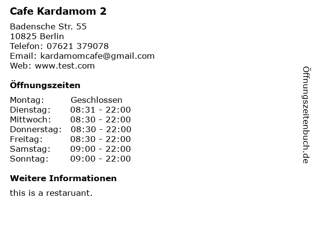 | Öffnungszeiten Cafe Kardamom 2 in Berlin anzeigen | |